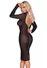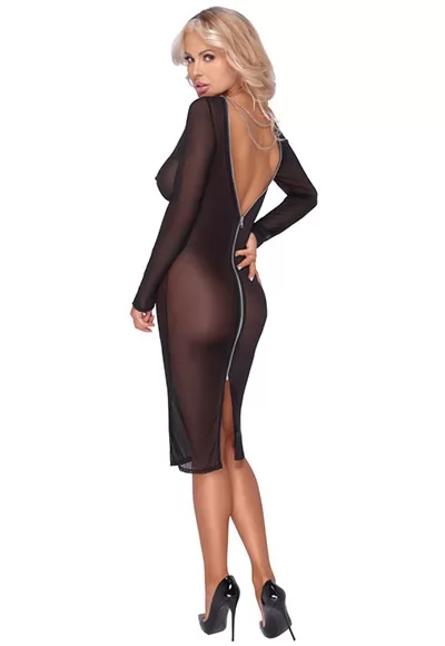 Delicate transparency with an exciting view at the back ! Knee length, long sleeved sheer dress with a close-fitting cut. Sexy dress made entirely of delicate, black powernet all-around excitingly transparent and stretchy soft. It features a spectacular view at the back and 2 detachable silver-coloured chains in the plunging V neckline. Beneath, a silver-coloured zip all the way to the walking slit of the hem. 90% polyamide, 10% spandex.