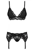 Beautiful 3-piece lingerie set in black lace that will enhance your body with grace and femininity. This lingerie set includes a padded triangle cup bra covered in lace, a matching thong and a garter belt decorated with elegant floral lace.