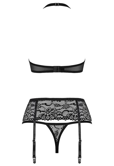 Here are all the details : Sexy bra with beautiful straps to enhance the bust, Nickel-free pendant jewel at the hollow of the neckline. Adjustable straps with closure behind the neck. Wide garter belt in sensual lace. Soft lace thong. Beautiful elastic Multistretch fabric (90% polyamide, 10% elastane). 3 pieces. Stockings sold separately in the store.