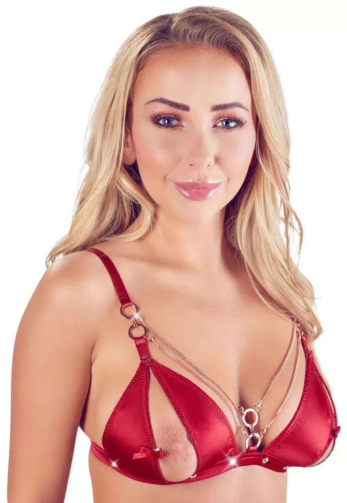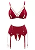 A suspender red sexy set with a wireless bra, suspender belt and crotchless string for sensual moments. The bra has slits in the cups and the cups can be open with a hook which is hidden by an elegant bow. Other sparkly decoration can be found on and over the bra, and on the suspender belt. The 6 suspender straps keep stockings in place while the long hook fastener at the back of the suspender belt helps it to fit perfectly. Erotic lingerie 94% polyamide, 6% spandex. Stockings sold separately.