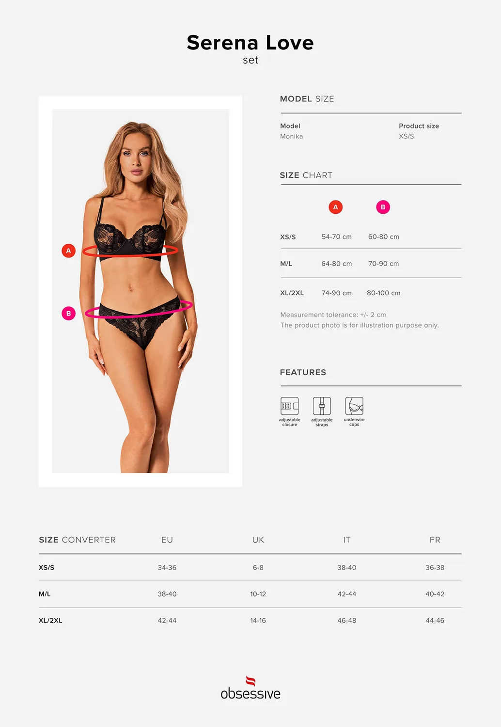 The Serena Love set includes a bra and panties from Obsessive brand. Adjustable, split straps. Underwired cups. Jewelry pendant between the breasts. Pleasant to the touch fabrics (90% polyamide, 10% elastane) 2 pieces
