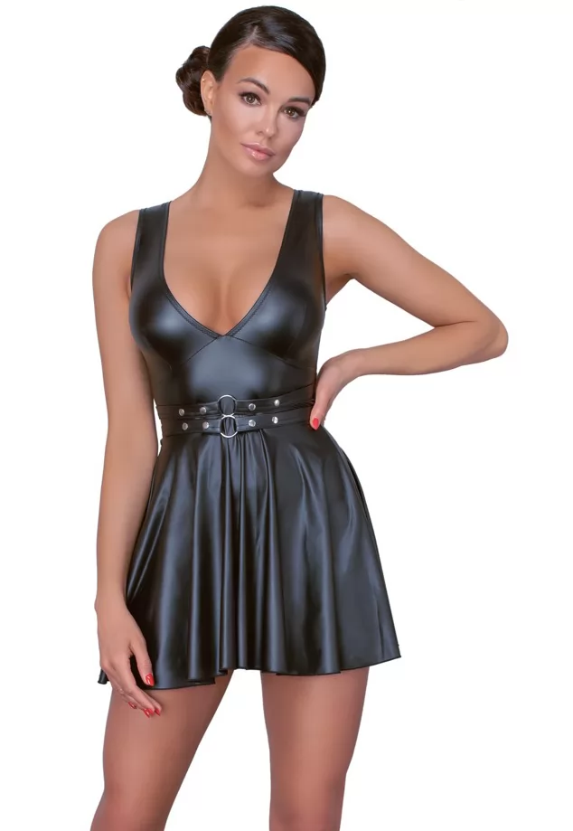 The short dress from Cottelli PARTY is made out of black matte look material. The top part of the dress is tight fitting and the bottom part is a flared, swaying skirt part. It is very low cut at the front. There is also an adjustable waist belt with two rings. Soft and stretchy for a comfortable fit. 90% polyester, 10% spandex. 1 piece