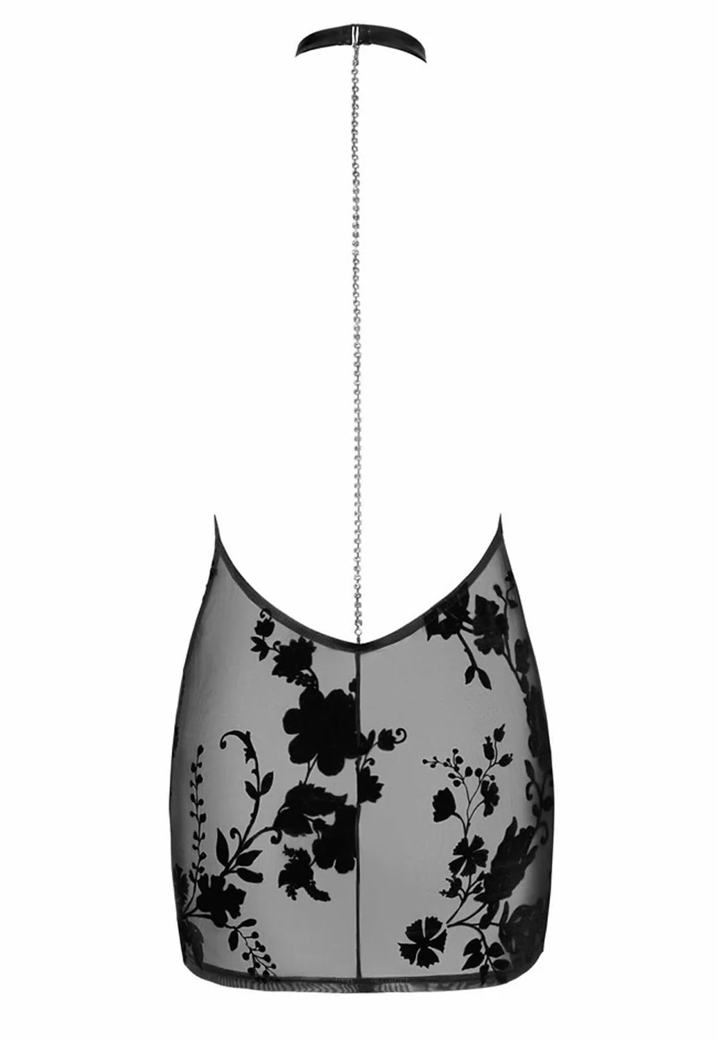 This ultra sexy sheer dress is perfect for women who dare to make a statement. The fine mesh, adorned with velvet floral patterns, offers a seductive look while maintaining an air of sophistication.