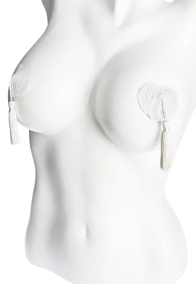 Heart shape sequin white pasties with tassels and reusable self adhesive backing. 1 pair
