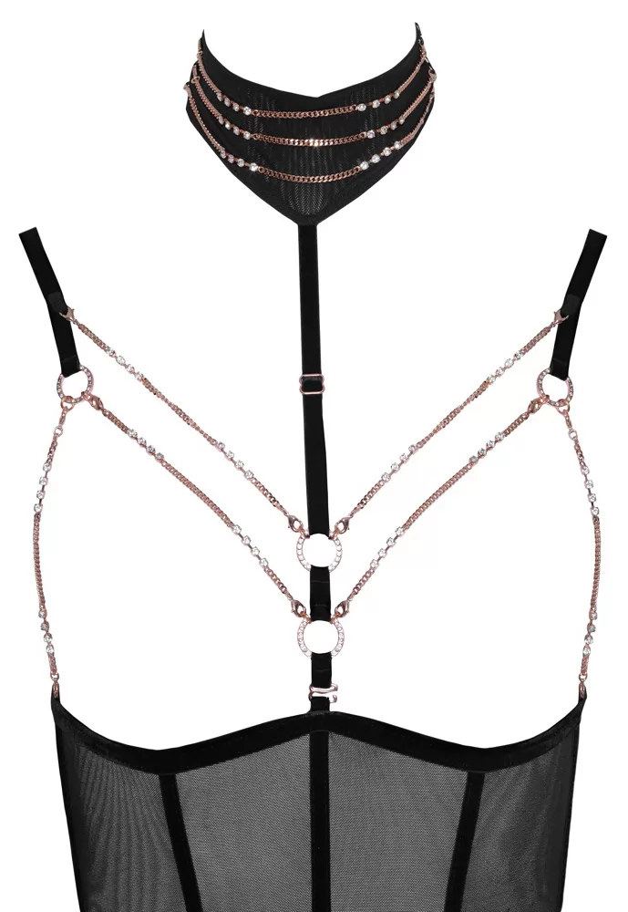 Élégant, invitant et révélateur ! Body terrriblement sexy à bonnets ouverts en résille d'Abierta Fina avec une zone d'entrejambe complètement ouverte, des bretelles en velours extensible et dses chaînettes de couleur or rose.