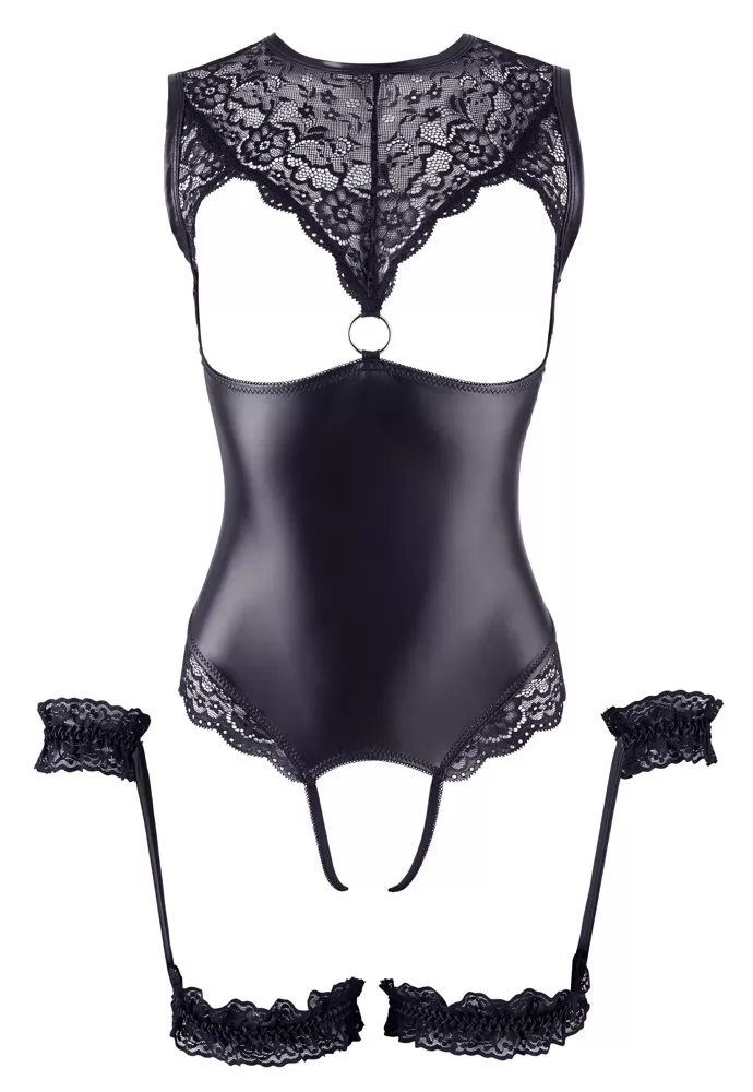 Body ouvert dentelle et effet cuir, accompagné de jarretières et menottes pour des jeux de séduction torrides !