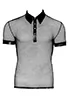 Quelle vue sexy ! Polo masculin avec boutons pression qui s'arrêtent à la poitrine. La chemisette coupe polo est fait d'un mélange séduisant d'aspect résille et wetlook et est sûr d'attirer l'attention de tous. 100% Polyester. 1 pièce.