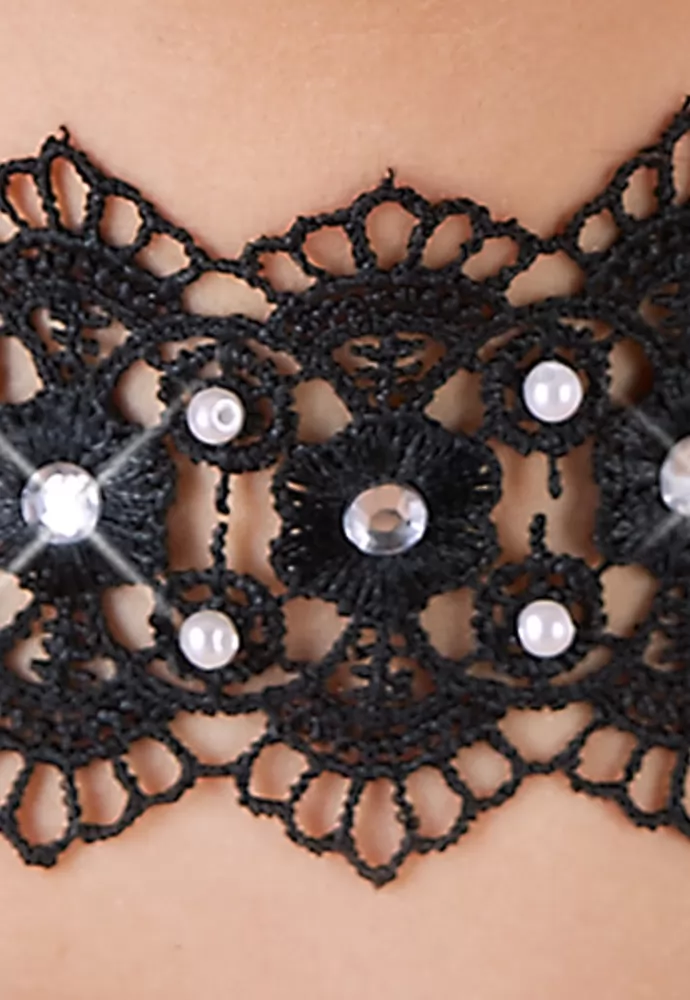 Un accroche-regard érotique ! Tour de cou brodé noir orné de perles blanches et de strass. Il y a un ruban de satin à l'arrière pour attacher le tour de cou. Env. 36 cm de long, env. 5 cm de hauteur. 100% Polyester.