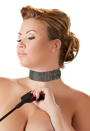 Collier ras de cou noir strass avec une large partie à l'avant, qui est recouverte de strass. A l'arrière une sangle plus fine a des boutons-pression qui permettent de choisir un réglage du tour de cou (25 à 42 cm de circonférence). Décoration de cou scintillante pour l'esclave ou la dominatrice! Matière: synthétique, croûte de cuir. 1 pièce.