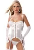 Ce corset blanc se maintient la poitrine grâce à des armatures et fin coussinet en mousse, le dos est en lycra et se ferme par agrafes. Lingerie de très belle qualité comprenant un corset et un string assorti. 2 pièces.