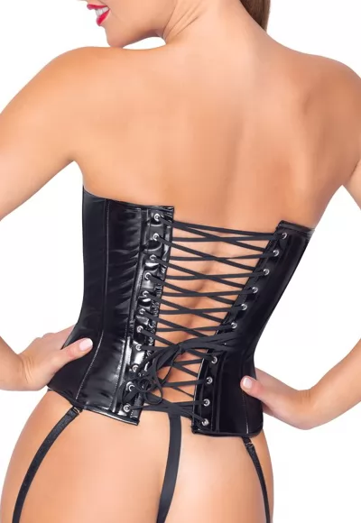 Corset en vinyl parfait pour souligner les courbes féminines, en particulier la taille! Corset sans bretelles en vinyle noir brillant. Les armatures intégrées garantissent un ajustement parfait et le maintien de la forme. Le corset en vinyle a une fermeture éclair à l'avant pour le vêtir facilement et un laçage sexy à l'arrière. Les 4 jarretelles sont réglables et amovibles. Le string est composé de bandes élastiques et d'un triangle en vinyle. 100% polyester, avec un revêtement en polyuréthane. 2 pièces.