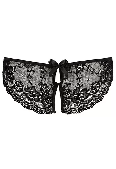 Cette culotte ouverte permet des aperçus coquins ! Cette jolie culotte associe une belle dentelle à motifs fleuris à des découpes devant et dos décorées de noeuds.