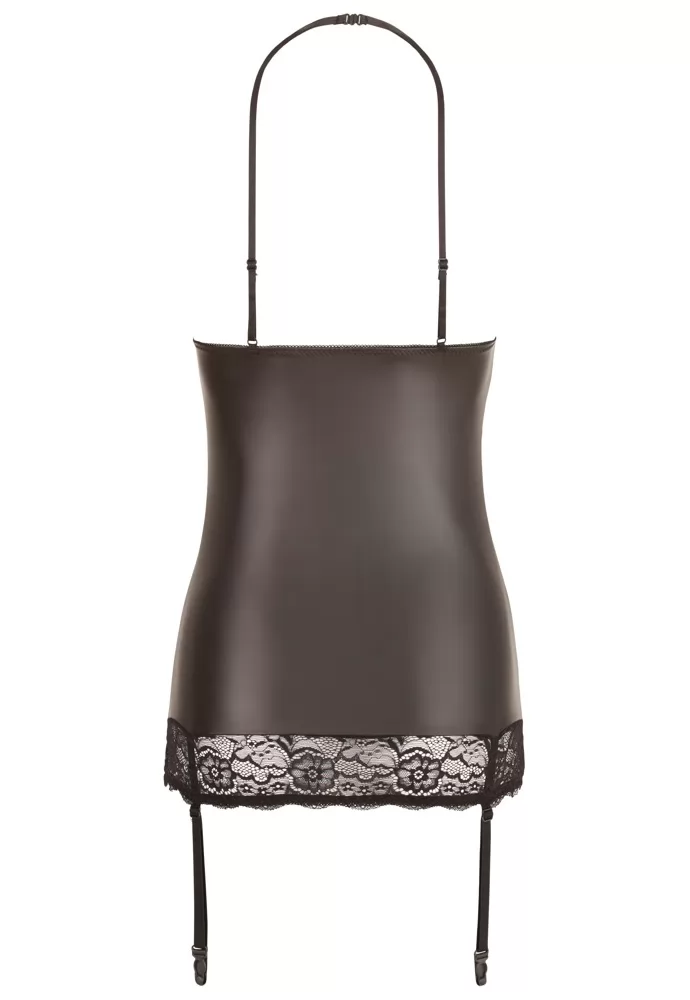 Cette guêpière sexy ouverte est décoréed'un bijou en strass sur le décolleté pour attirer l'attention, la dentelle met en valeur la poitrine. Les bretelles et les 4 jarretelles sont réglables. Coloris noir. Composition Cuir simili : 92% Polyester, 8% Elasthanne, dentelle : 90% polyamide, 10% elastanne
