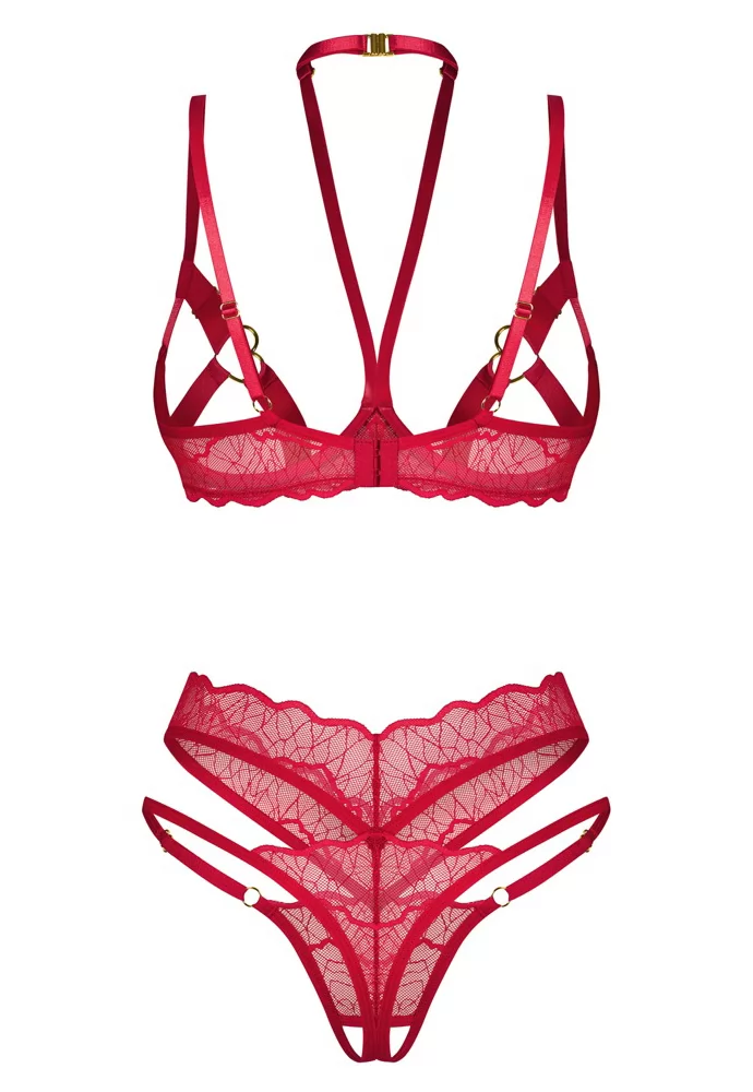 Une attirance folle dans une couleur rouge sensuelle ! L'ensemble ouvert Cupide Desir d'Obsessive contient un soutien-gorge et un string. L'ensemble minimaliste est en dentelle délicate dans une couleur rouge sensuelle avec des détails dorés.
