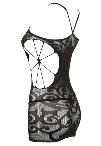 Belle et extensible pour un ajustement parfait! La mini-robe noire est faite d'une résille sans couture et présente un motif décoratif arabesques, des bretelles extensibles et des ouvertures des deux côtés. Cette magnifique robe clubbing est livré avec un string en dentelle. Composition de la mini robe arabesque clubbing sexy 90% polyamide, 10% élasthanne.