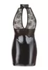 Superbe robe fetish, très féminine, mini et près du corps, mettant en valeur la poitrine par sa coupe bustier et le décolleté par de la dentelle transparente.