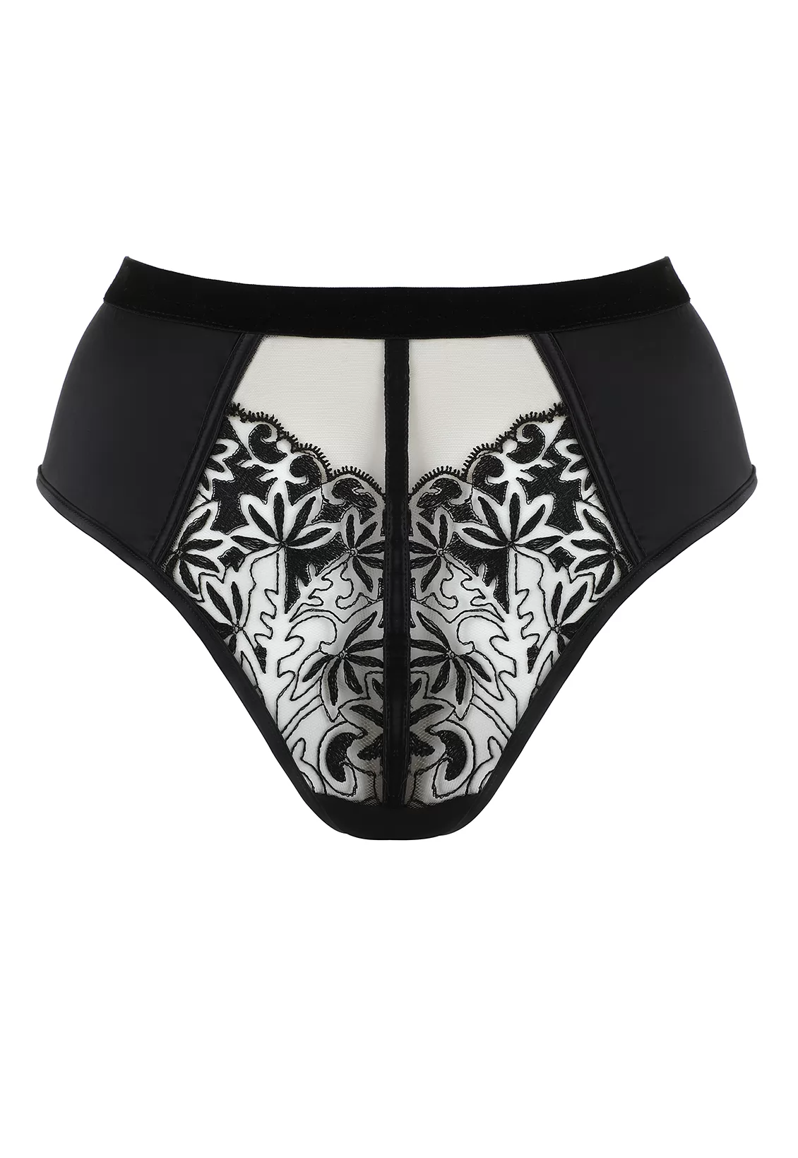 Ce shorty TANGO est conçu dans des matières nobles : un tissu satiné, du tulle et broderie en transparence sensuelle, et une finition en velours sur la taille.